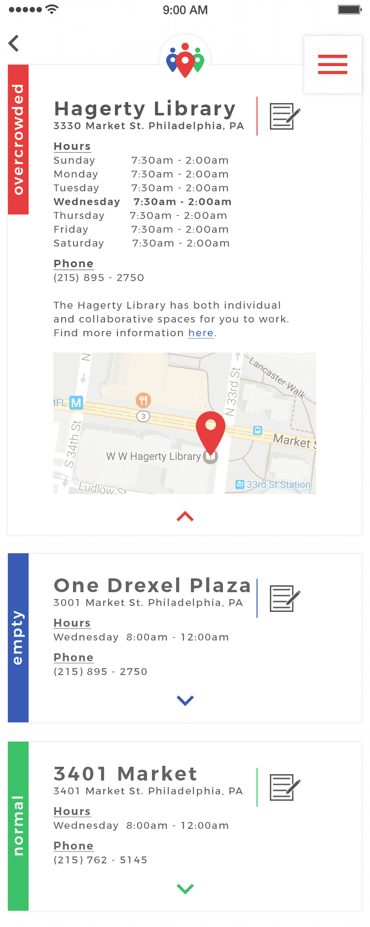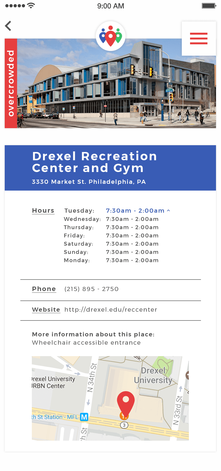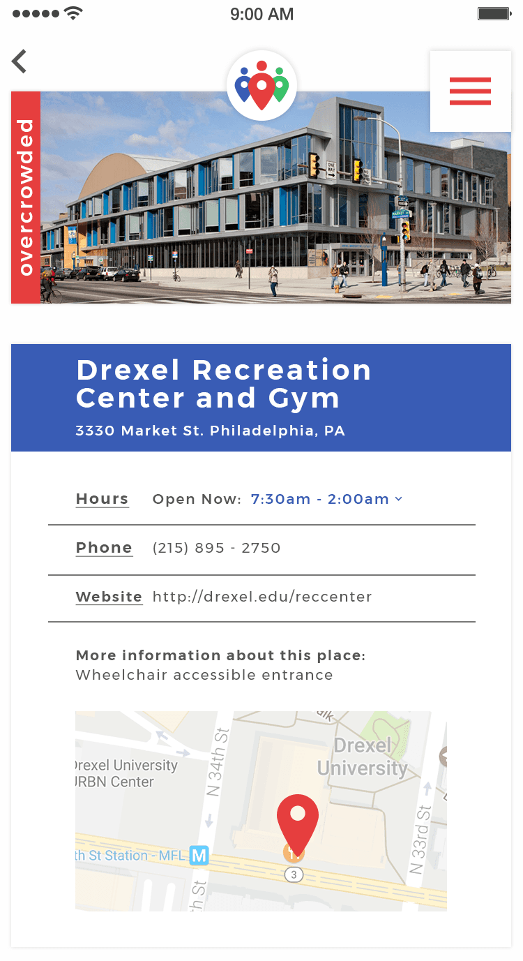 I created three style tiles that the team discussed and tested through user interviews. I evolved the branding through multiple iterations and retesting until arriving at the final brand and styling. The styles were designed for flexibility and scalability so they could potentially incorporate university branding. I also developed secondary colors for each crowding level to provide clear visual communication.