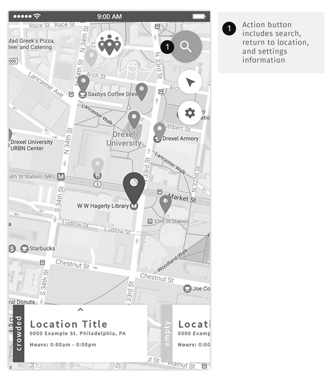 When testing wireframes, a map-focused design proved most effective for enabling exploration while maintaining simplicity. It closely connected the location-based concept to the user experience. We settled on four crowding levels, providing enough variation to be useful without overwhelming users. Since crowding varies by venue capacity, we used subjective rather than quantitative markers.